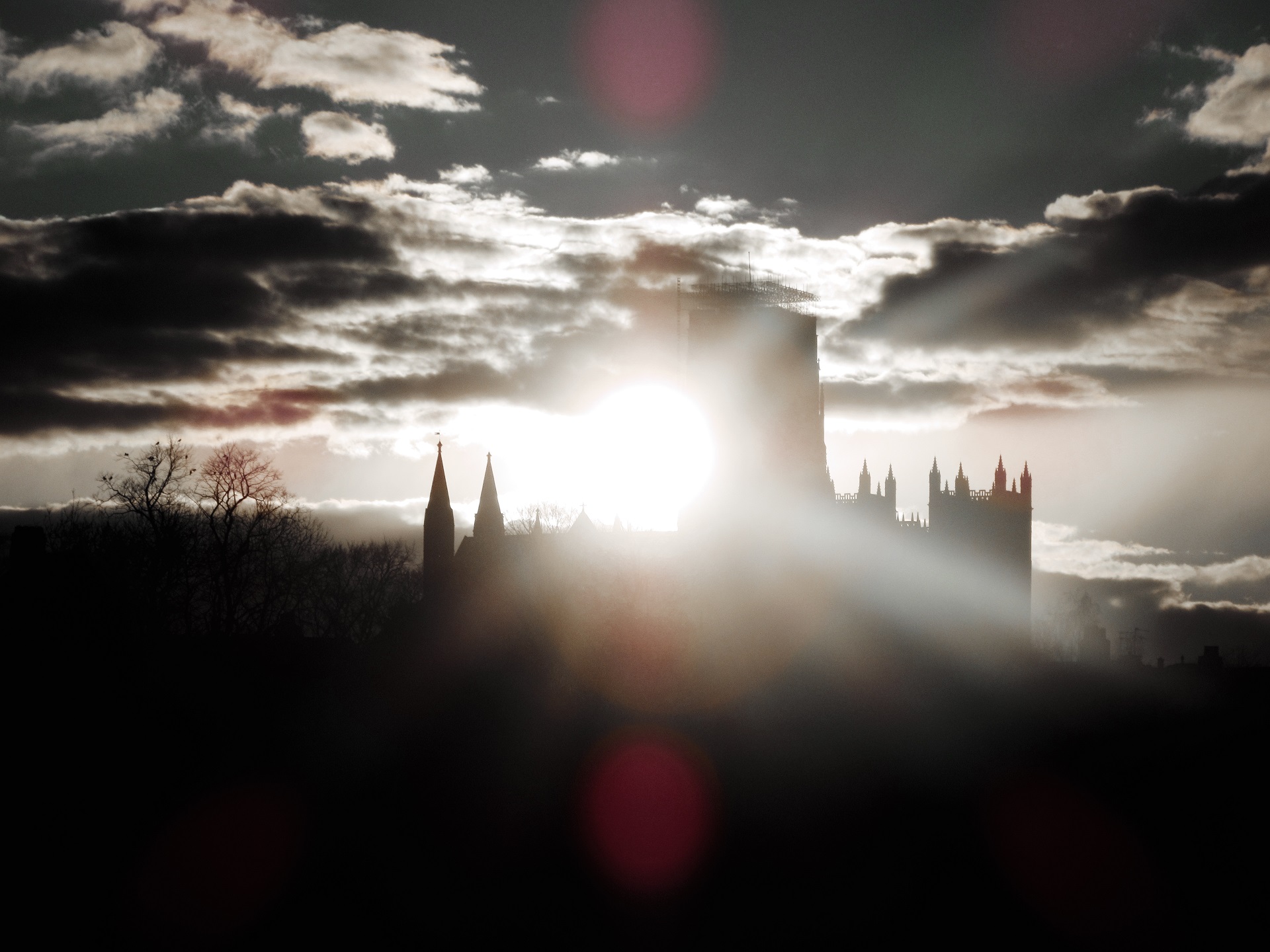 Happened to be walking along the racecourse one evening when there was a perfect sunset behind the Cathedral. The thing you can see the the top is the start of the scaffolding. Shortly after, the whole of the tower was covered in plastic sheets.